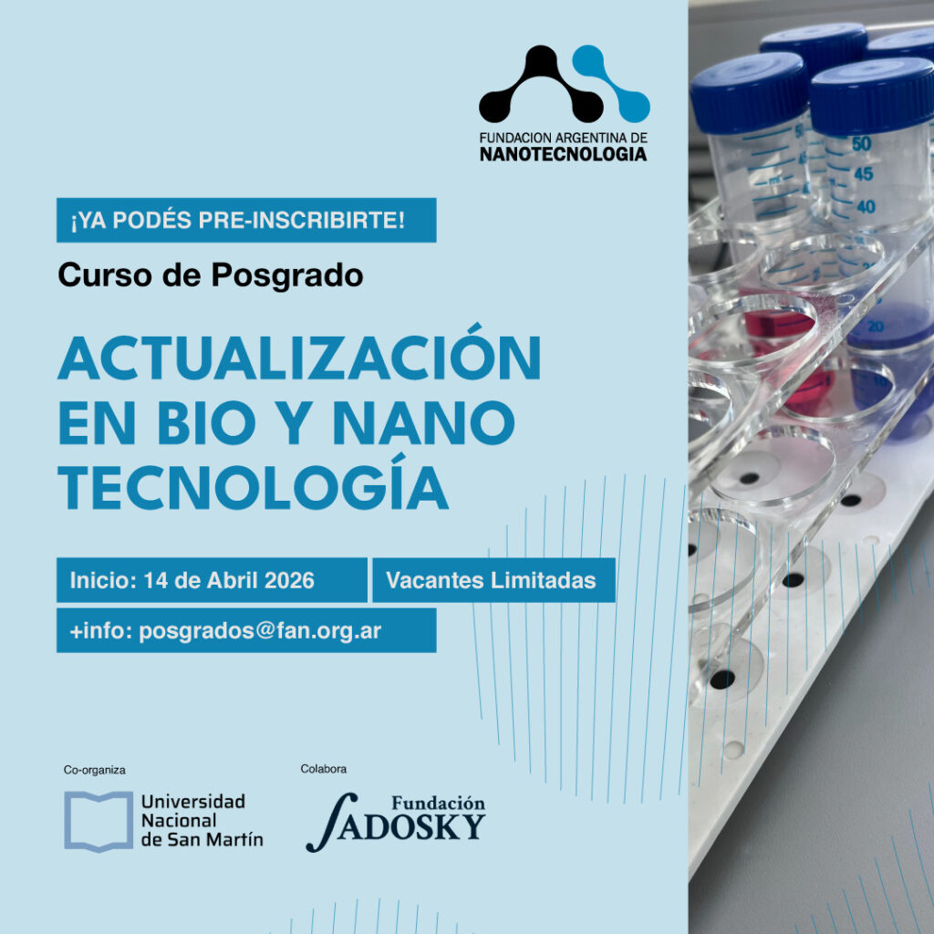 Se encuentran abiertas las inscripciones para el curso de posgrado de Actualización en Bio y Nanotecnología que organiza la Fundación Argentina de Nanotecnología, co-organiza la Escuela de Bio y Nanotecnología de la Universidad Nacional de San Martín y cuenta con el apoyo de la Fundación Sadosky.